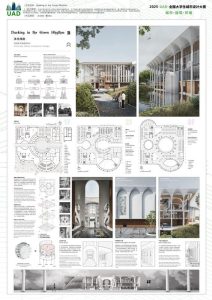 作品描述:本设计是以生态为主导的大学图书馆建筑设计,为了适应长春市北部的湿地环境,做到建筑与自然环境的和谐共生,整个建筑驾于湿地的水面之上,水流从建筑中心流过,没有改变场地原本的生态环境。图书馆自古是学习与交流的场所,从拉斐尔的名画《雅典学院》中,先哲们在穹顶下探讨知识,图书馆一般为具有古