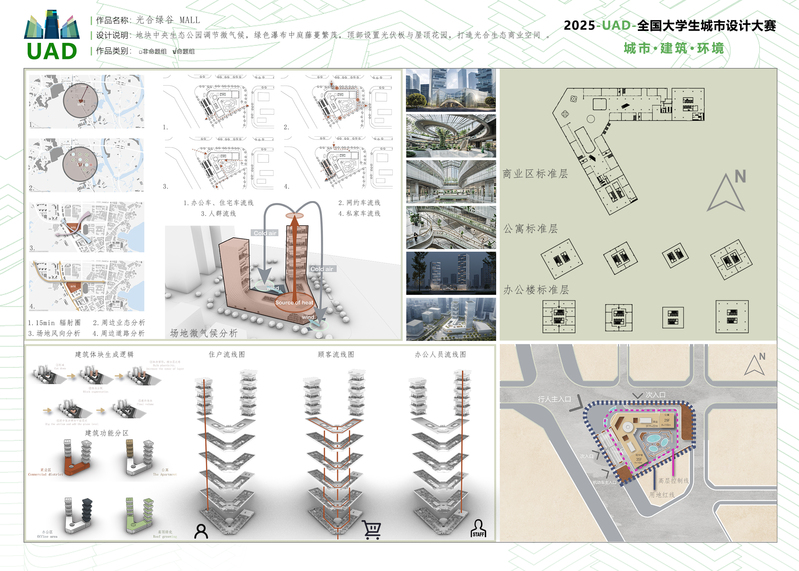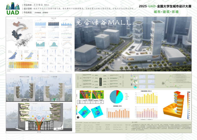 作品描述:本次建筑设计以“绿色中庭、建筑、水池、中心公园、自然、环保材料”为关键词,旨在创造一个生态友好且与自然和谐共存的空间。建筑围绕一个中央绿色中庭布局,中庭内设置水池和喷泉,为建筑内部提供视觉焦点和听觉享受。中心公园作为社区的绿肺,与建筑群相互渗透,鼓励居民与自然互动。 建筑外观采用流线型设计,与周围环境相融合,外墙覆盖本地植物,减少热岛效应。屋顶花园的设计增加了生物多样性,同时收集雨水用于灌溉。水池和水景使用循环水系统,减少水资源消耗。