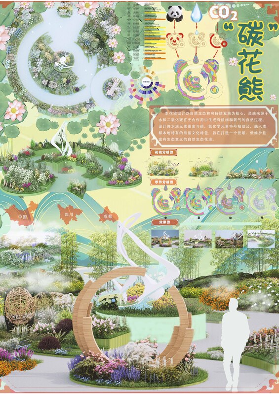 作品描述:本花境设计以自然生态和可持续发展为核心,灵感来源于水和二氧化碳在光合作用中生成有机物和氧气的自然过程。设计将水滴元素图案与碳、氧化学元素符号相结合,融入成都本地特有的熊猫文化特色,旨在打造一个低碳、低维护且富有生态意义的自然生态花境。
