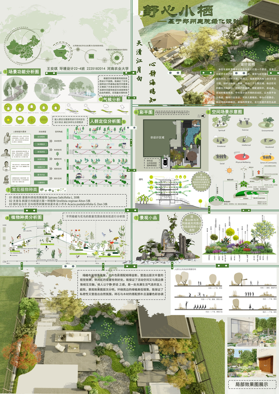 作品描述:本景观设计紧扣低碳减排理念。选用本地适生植物,降低养护能耗;设置雨水收集系统,用于灌溉,减少水资源浪费;采用太阳能照明设施,利用清洁能源;打造慢行系统,鼓励绿色出行,从多方面降低碳排放,构建生态友好景观 。