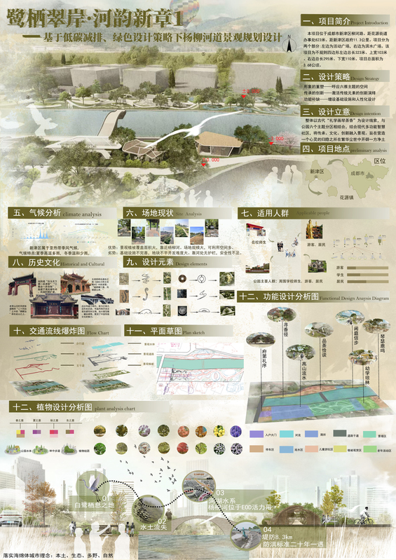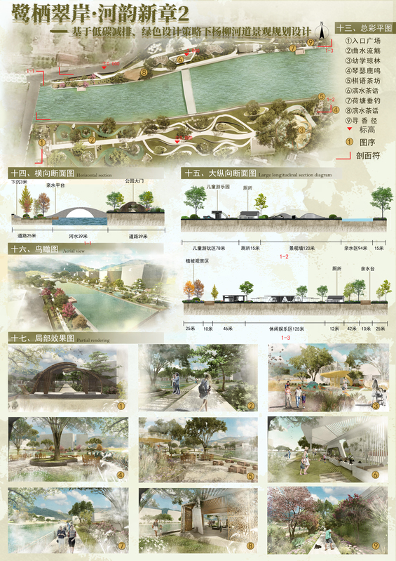 作品名称:鹭栖翠岸·河韵新章——基于低碳减排、绿色设计策略下杨柳河道景观规划设计