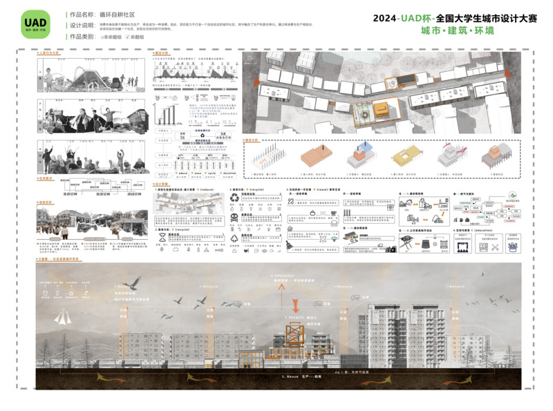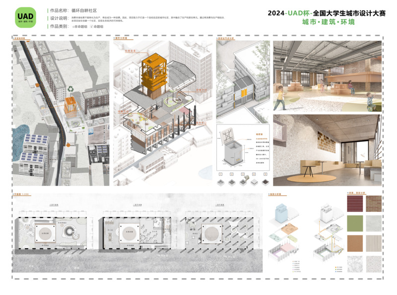 作品描述:消费本身如果不能转化为生产,将会成为一种浪费。因此,项目致力于打造一个自给自足的城市社区,其中融合了生产和居住单元。通过将消费与生产相结合, 该项目旨在创建一个社区,实现生态经济的可持续性。