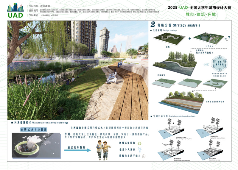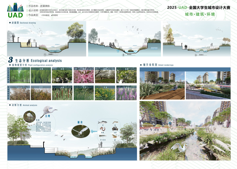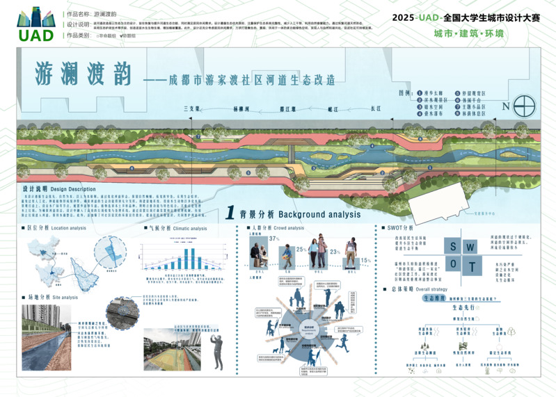 作品描述:本设计位于四川省成都市温江区游家渡社区,以生态为主对河道改造。遵循生态优先,减少人工干预,利用自然修复维护生态完整。通过恢复天然河道形态、采用生态护岸技术,营造水生生物栖息地,增加植被覆盖。同时兼顾居民休闲需求,打造集生态、景观、休闲于一体的绿色空间,促进社区可持续发展。